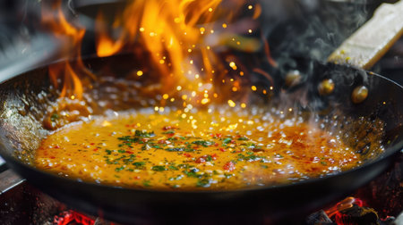 Spicy yellow curry sauce with herbs simmering in a wok, flames rising dramatically in the background