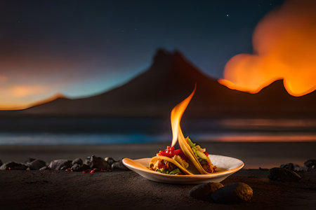 spicy hot mexican tacos on the beach with volcano in the background. Selective focus.