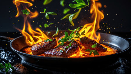 Juicy grilled steaks sizzling in a flaming pan with fresh green herbs flying in the air. The vibrant flames and dark background create a dramatic cooking scene.