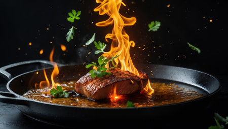 Grilled salmon fillet garnished with fresh parsley, surrounded by vibrant flames in a black skillet. The dramatic cooking scene highlights the rich texture and smoky ambiance.
