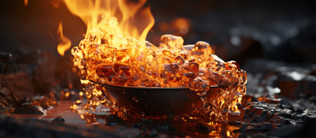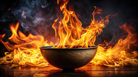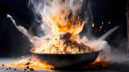 Risotto in a bowl with fire and smoke on a black background, Generative Ai art