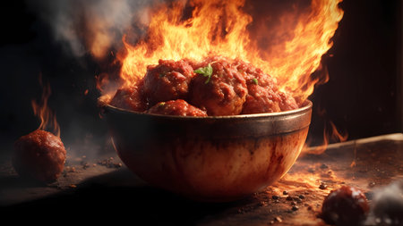 Flaming spaghetti with meatballs and vegetables on a black background.Generative AI