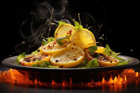 salad with lemon and basil on a black background with fire flames, Ignite your taste buds with a flaming lemon-infused culinary masterpiece, showcasing the dynamic interplay, AI Generated