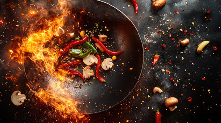 Top view of a dramatic cooking moment featuring a wok pan with ingredients like mushrooms and peppers caught mid-air