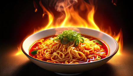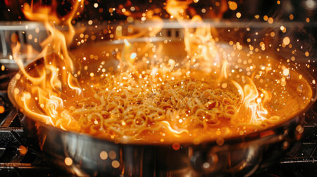 Noodles boil in a pan as bright flames engulf the dish, creating a dramatic culinary moment while cooking.