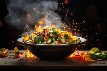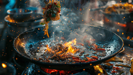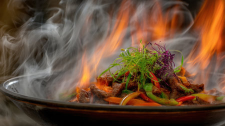 A captivating image of sizzling beef stir-fry showcases vibrant vegetables and flames dancing amidst aromatic steam. Perfect for food-related themes.