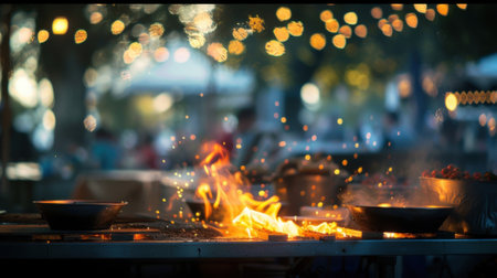 The vibrant flames create an inviting atmosphere for culinary delights. A skilled chef meticulously prepares a savory meat dish in a sizzling frying pan over an open fire, enhancing the rich flavors.