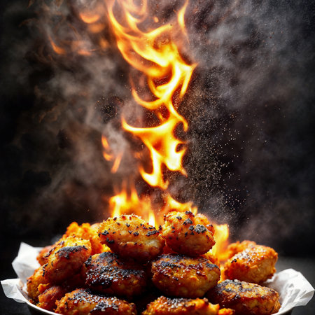 A stunning close-up of steaming hot dumplings cooking on a griddle, featuring flames and smoke, showcasing mouthwatering textures and inviting flavors.
