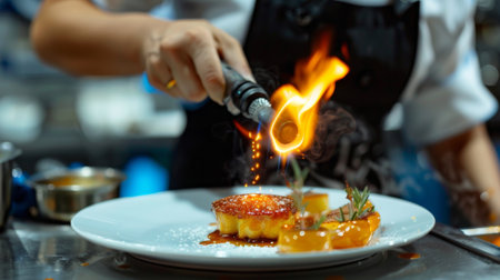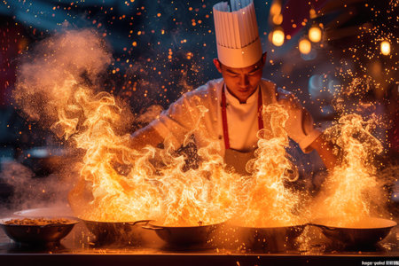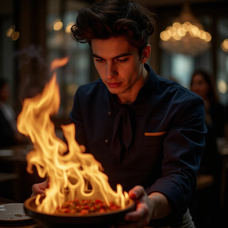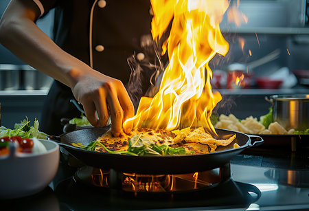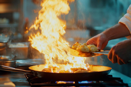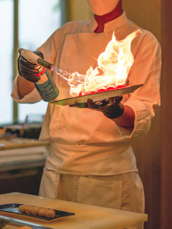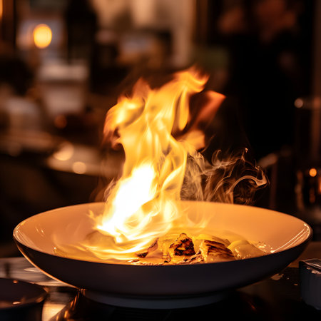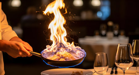 Professional chef demonstrating flamb? technique in the kitchen of a gourmet restaurant