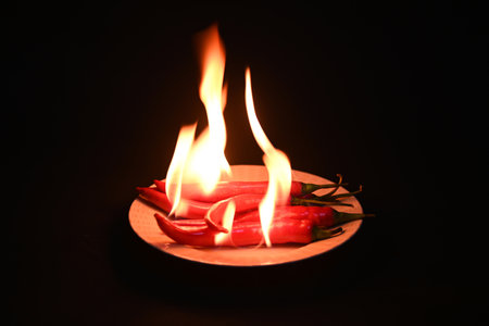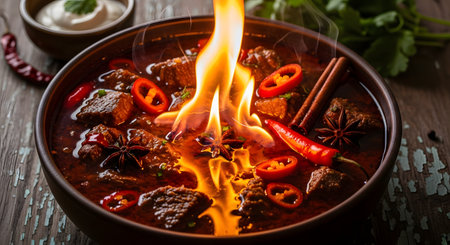 A ceramic bowl filled with spicy meat stew features blazing fire flames rising from the center, emphasizing the heat and spice level. The dish is garnished with red chili peppers, star anise, and cinnamon sticks, presented on a dark wooden background.