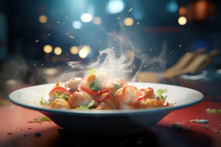 A beautifully presented shrimp dish with fresh herbs and steam rising, capturing the essence of gourmet dining. Ideal for culinary promotions and food lovers.