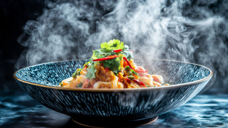 A captivating image showcasing a bowl filled with vibrant ingredients, steam rising dramatically. Fresh herbs and spices create a visually stunning culinary moment.