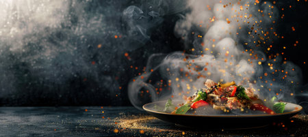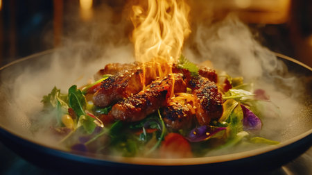 A sizzling platter of grilled meat topped with fresh vegetables and vibrant colors. This gourmet dish is perfect for showcasing culinary excellence.