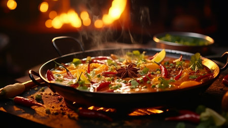 Bowl of steaming hot soup with colorful ingredients. Hot spicy soup concept. Generative AI.