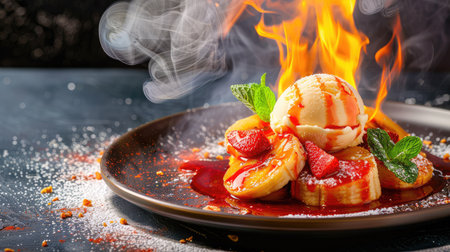 A stunning dessert featuring flaming bananas, creamy ice cream, and fresh strawberries garnished with mint leaves, creating a vibrant culinary experience.