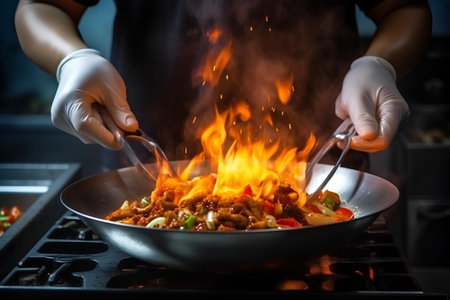 Chef cooking vegetable food on frying pan with rum fire flame. Restaurant and hotel service concept on black background with space for menu or recipe. Flambler or cooking on natural fire.