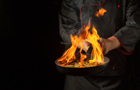 Chef cooking food in pan with fire flame on black background. Restaurant and hotel service concept. Free advertising space