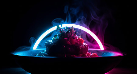 A glowing AI interface displaying a virtual chef at work, crafting a dish pixel by pixel with bright ingredients popping up as the dish takes shape in 3D.