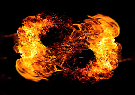 Drawing shapes with fire at night, infinity sign, bright colors on night background, fun with fire. Abstract fiery pattern in the shape of the number 8.
