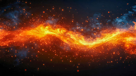 Abstract fiery stream with dark blue smoke, glowing embers, and bokeh lights. Dynamic, energetic, and intense visual