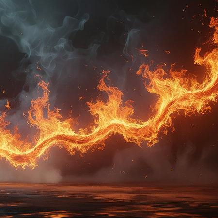 A dynamic wave of bright orange flames and wisps of smoke flows across a dark, textured background with glowing embers on the ground.