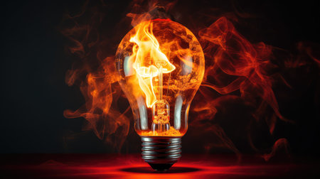 A light bulb engulfed in flames surrounded by lush green foliage.