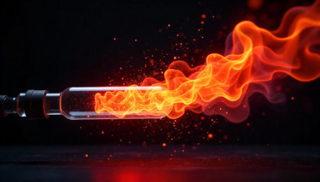 Burning substance inside glass test tube against dark background