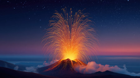 Witness a stunning volcanic eruption at twilight, showcasing vibrant lava fountains and billowing ash against a serene night sky, perfect for nature lovers and photographers.