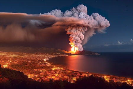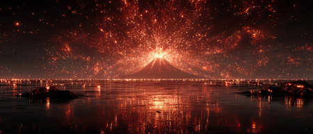 A volcano erupts, spewing lava and smoke into the night sky. The scene features fiery orange and red hues against a dark backdrop. The composition highlights the raw power of nature. Suitable for illustrating geological phenomena, environmental themes, or dramatic visual content.