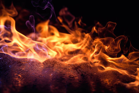 Witness the captivating power of fire with this intense image. A close-up view of fire flames takes center stage against a dark black background, creating a mesmerizing and dynamic composition. The vibrant and flickering flames create a sense of energy and intensity, while the black backdrop adds depth and drama to the scene. Perfect for projects related to heat, energy, passion, danger, and the elemental force of fire