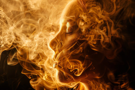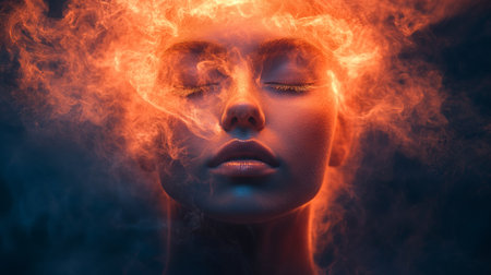 A dynamic image of a woman's profile engulfed in glowing fiery textures, symbolizing power and energy in a surreal artistic style.