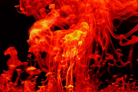 A vivid, fiery wave of red and orange hues against a dark background, creating an abstract scene of intense heat and motion.