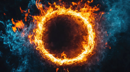 A captivating image showcasing a detailed ring of fire with vibrant, intense flames against a stark, dark background, creating a visually striking and mesmerizing effect conveying energy and passion. AI generated image