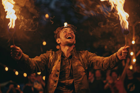 A juggler skillfully tossing and catching flaming torches with a big grin captivating spectators with daring feats