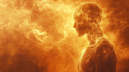 A silhouette of a man is outlined in radiant flames, embodying resilience and change amid a dynamic fiery background. The illuminating glow enhances the powerful presence.