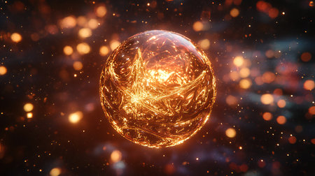A golden, swirling form of light against a dark backdrop, evoking the essence of energy and motion in an abstract digital art style sphere.