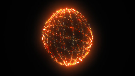 Abstract glowing orange globe formed by swirling digital particles creating a network of motion.