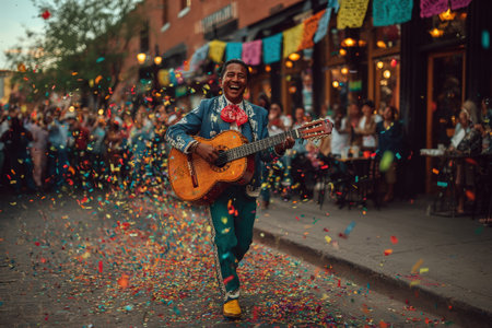 Male musician in traditional attire plays guitar at lively street festival, with confetti falling and colorful decorations creating a joyful ambiance celebrating culture