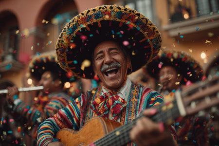 Happy Mexican musician strumming guitar, surrounded by fellow performers in traditional attire, celebrating with colorful confetti in a lively outdoor atmosphere