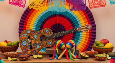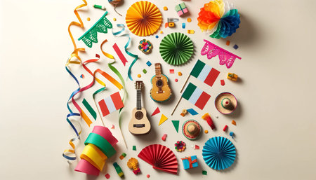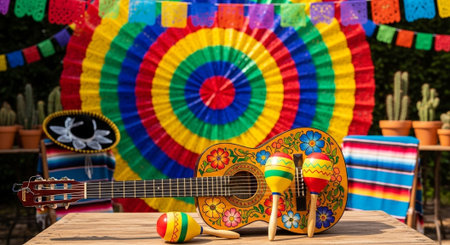 Mexican fiesta background with colorful decorations, confetti, guitar, and sombrero, AI generated