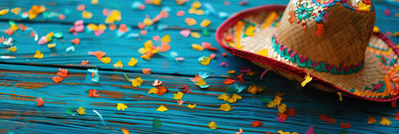 Mexican sombrero hat and colorful confetti on wooden background