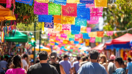 A lively street festival scene filled with vibrant decorative flags. People stroll through a colorful market under a sunny sky, celebrating culture and community.