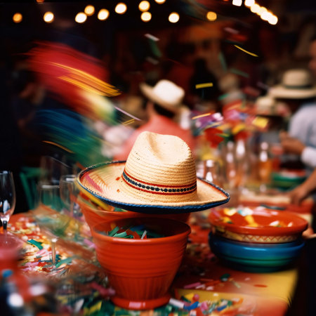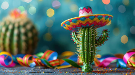 A vibrant and colorful display featuring a straw sombrero, festive paper decorations, and cacti, perfect for celebrating cultural events or parties.