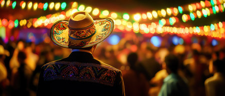 Back view of mariachi performer wearing detailed sombrero and embroidered suit, surrounded by dazzling lights, exuding festive spirit. Concept of Cinco de Mayo, Mexican fiesta, celebration, party