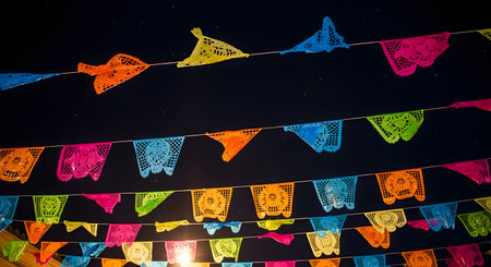 Colorful Mexican 'papel picado' banners are strung across a dark night sky. The intricately cut paper flags are brightly colored in pink, blue, orange, and green, commonly used for celebrations like Dia de los Muertos or other fiestas.