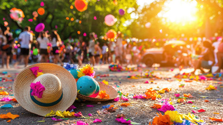 Colorful maracas and hats lying on festival ground, sunlit copy space