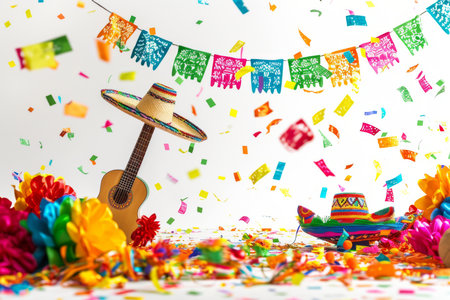 A charming miniature Mexican vihuela (a guitar-like instrument) and a colorful sombrero rest on a vibrant yellow background. Surrounded by traditional papel picado (cut paper banners) and confetti, this composition embodies the joyful spirit of a cultural fiesta, such as Cinco de Mayo.
