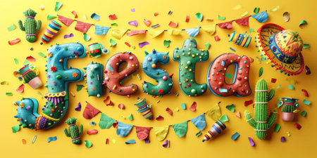 Cartoon Fiesta balloon text with colorful decorations and cacti on yellow background, AI generated