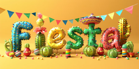 Cartoon Fiesta balloon text with colorful decorations and cacti on bright background, AI generated