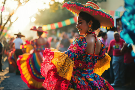 People in traditional Mexican clothing smiling and dancing outdoors, festive atmosphere, AI Generated